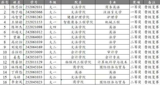 恭喜以上同学成功晋级复赛!你们的出色表现不仅赢得了观众和评委们的阵阵掌声,也充分展现了无锡太湖学院学子的卓越风采和深厚语言功底。祝贺入围的16位同学,请做好校级复赛准备。校级复赛题目与初赛一致,均为Strike the Waves。本次比赛包括两分钟的定题演讲与外教提问两个环节。请参赛同学于10月16日下午12:30到商科楼A307教室签到,并按照号码领取号码牌,比赛将于10月16日下午一点正式开始。