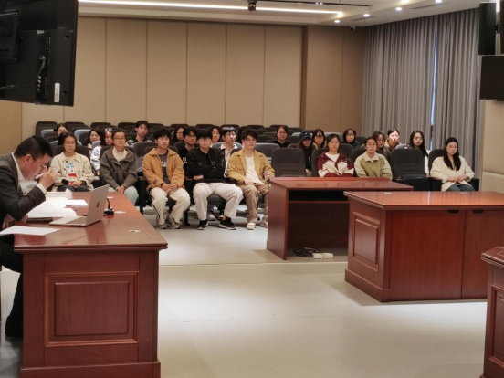 现场气氛热烈,庭审结束后,师生仍意犹未尽。杨洋法官特意留出时间,与同学们进行了深入的互动交流。同学们结合庭审案例与课堂所学,踊跃提问。杨洋法官以其深厚的法学素养和丰富的审判经验,对同学们的提问给予了细致且富有启发性的解答。他不仅剖析了案件背后的法理,还分享了自己的思考逻辑与职业感悟,赢得了师生们的阵阵掌声。